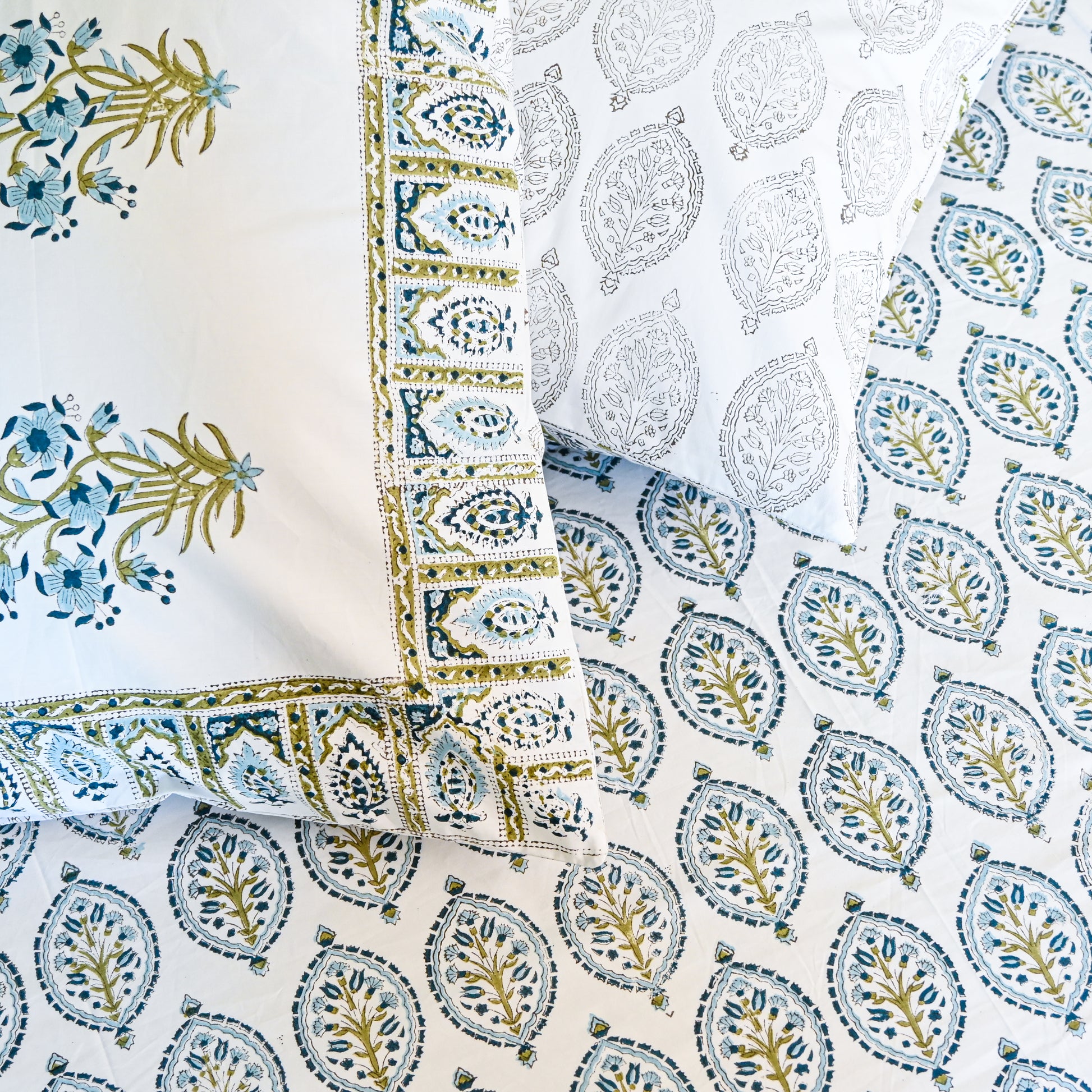 The intricate floral motifs, delicately hand-printed in soft green tones, create a refined and calming aesthetic, while the smooth cotton fabric ensures both comfort and durability. Perfect for those who appreciate artisanal craftsmanship and regal décor, this set adds a touch of ethnic-inspired sophistication to any space.