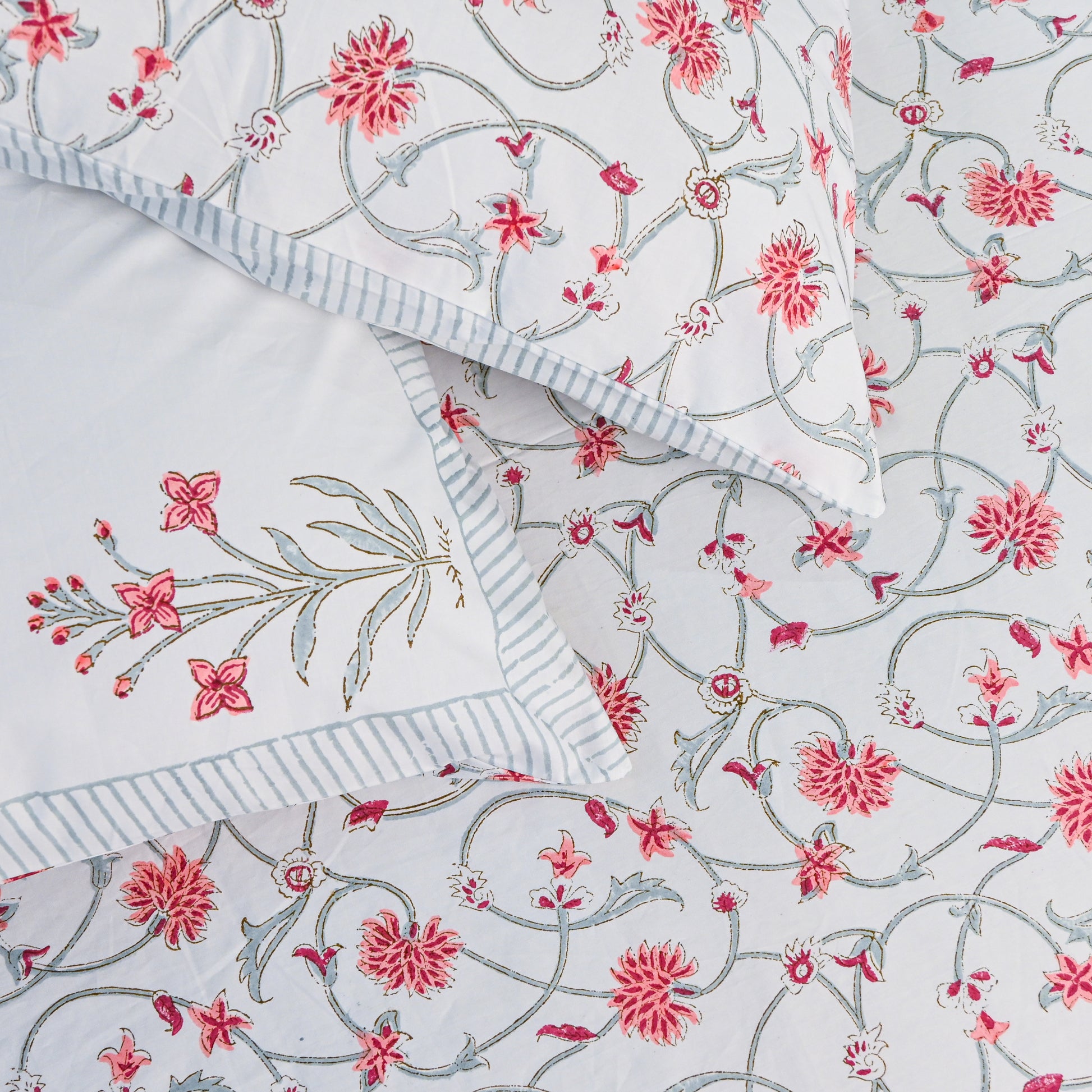 The intricate floral motifs, delicately hand-printed in soft green tones, create a refined and calming aesthetic, while the smooth cotton fabric ensures both comfort and durability. Perfect for those who appreciate artisanal craftsmanship and regal décor, this set adds a touch of ethnic-inspired sophistication to any space.