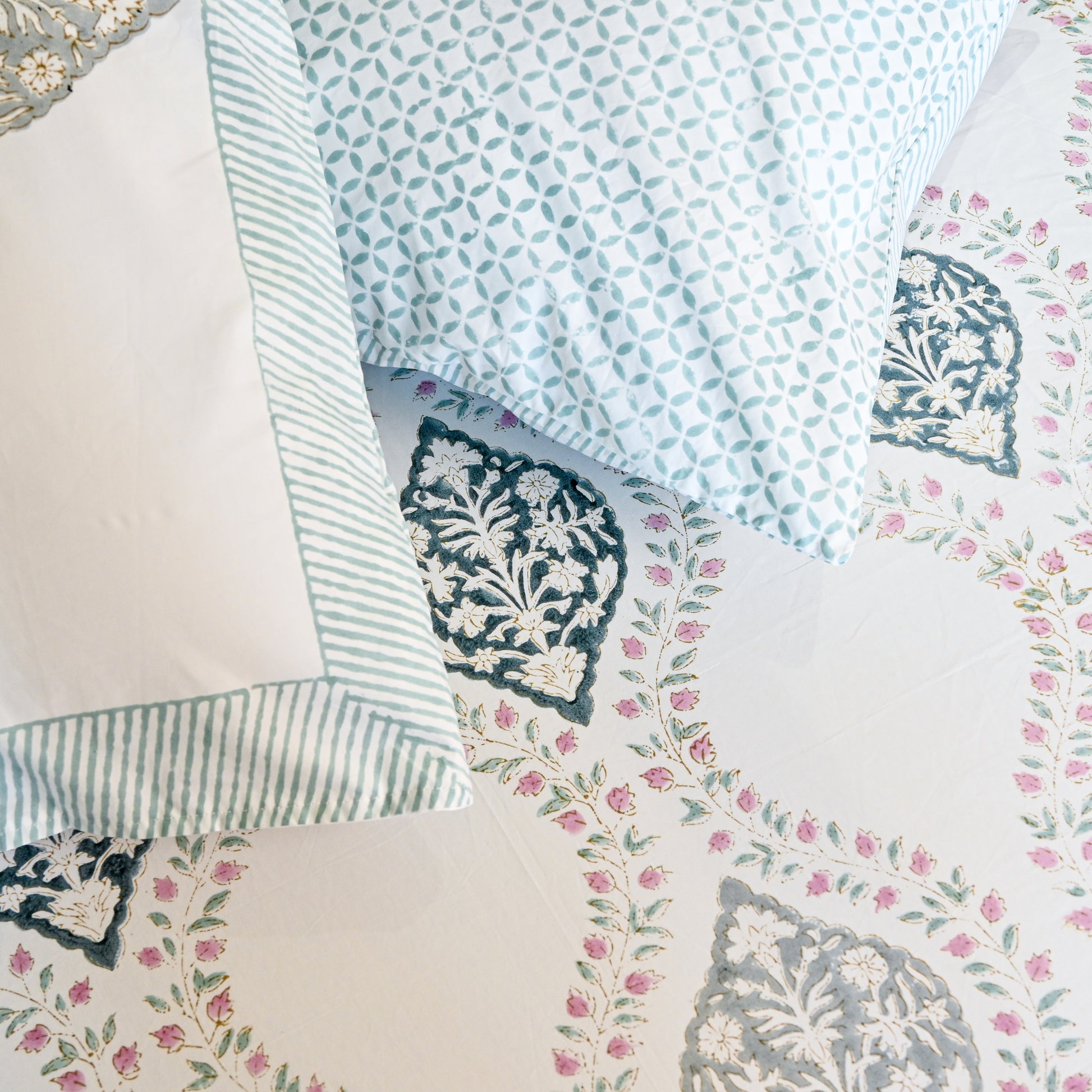The intricate floral motifs, delicately hand-printed in soft green tones, create a refined and calming aesthetic, while the smooth cotton fabric ensures both comfort and durability. Perfect for those who appreciate artisanal craftsmanship and regal décor, this set adds a touch of ethnic-inspired sophistication to any space.