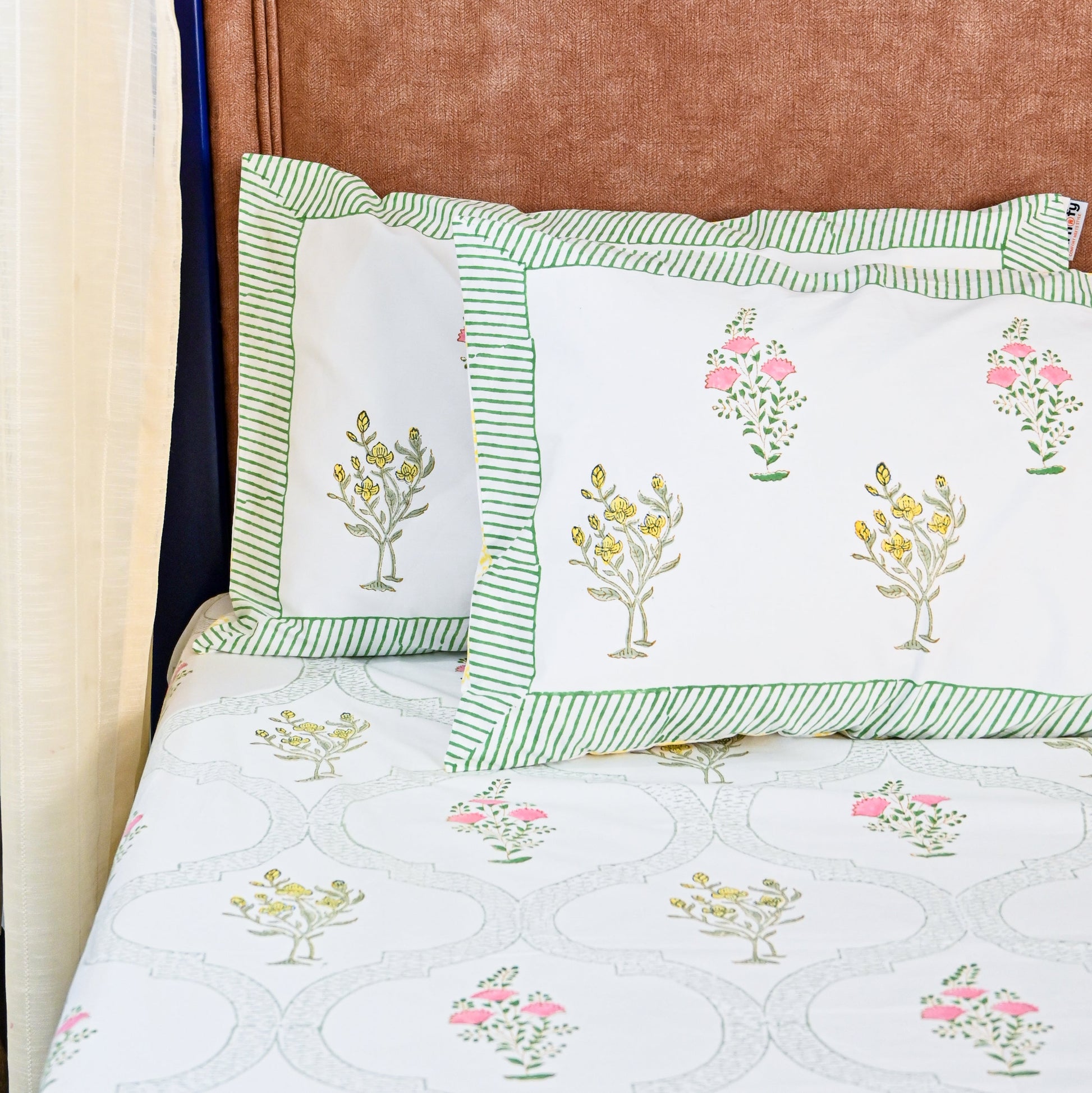 The intricate floral motifs, delicately hand-printed in soft green tones, create a refined and calming aesthetic, while the smooth cotton fabric ensures both comfort and durability. Perfect for those who appreciate artisanal craftsmanship and regal décor, this set adds a touch of ethnic-inspired sophistication to any space.