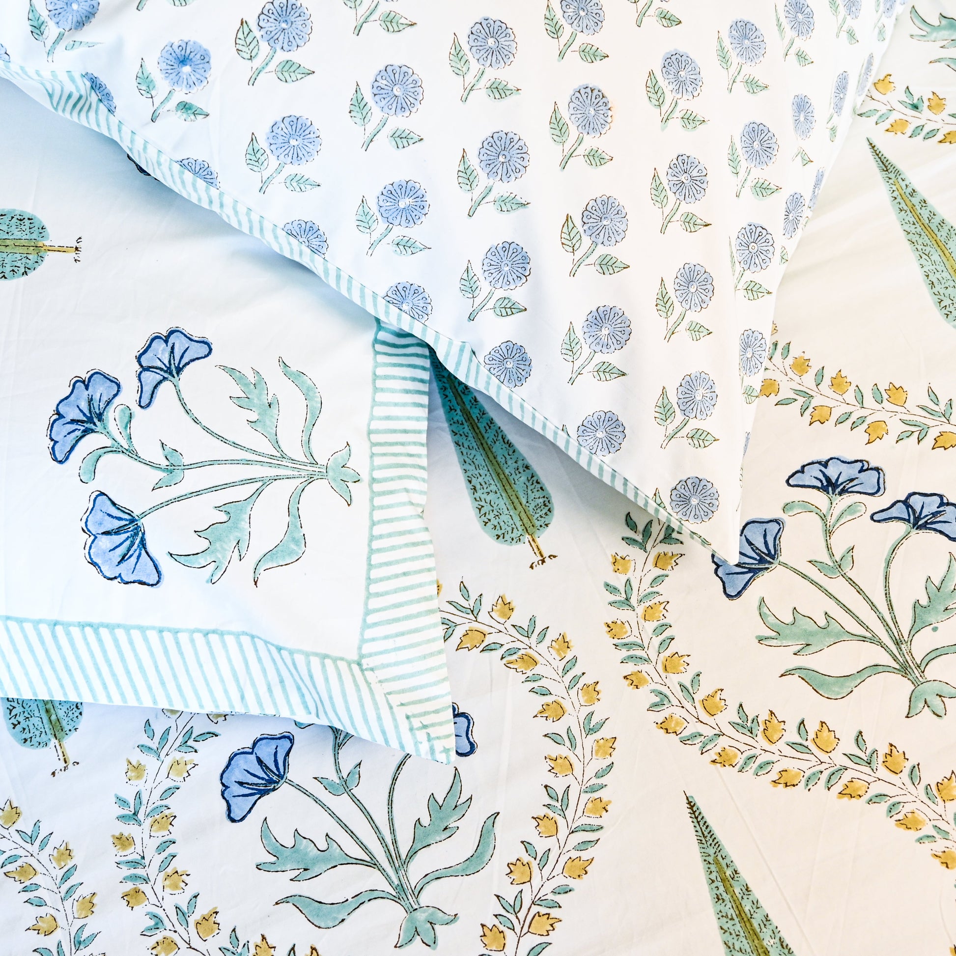 The intricate floral motifs, delicately hand-printed in soft green tones, create a refined and calming aesthetic, while the smooth cotton fabric ensures both comfort and durability. Perfect for those who appreciate artisanal craftsmanship and regal décor, this set adds a touch of ethnic-inspired sophistication to any space.