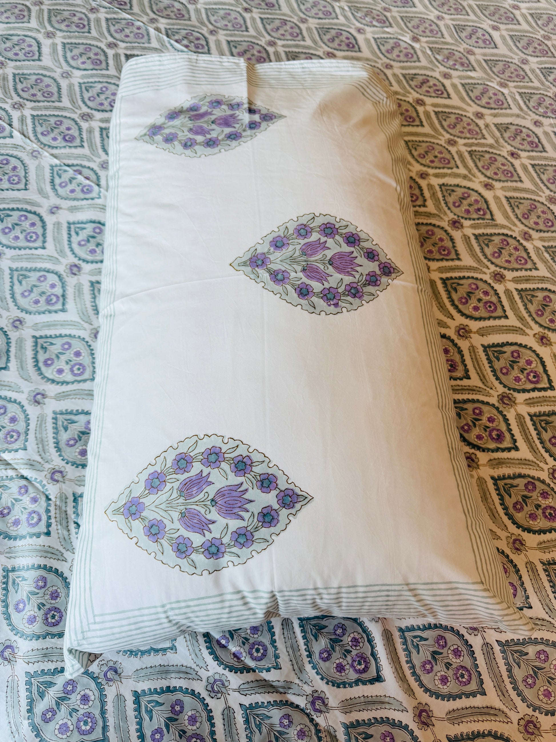 The intricate floral motifs, delicately hand-printed in soft green tones, create a refined and calming aesthetic, while the smooth cotton fabric ensures both comfort and durability. Perfect for those who appreciate artisanal craftsmanship and regal décor, this set adds a touch of ethnic-inspired sophistication to any space.