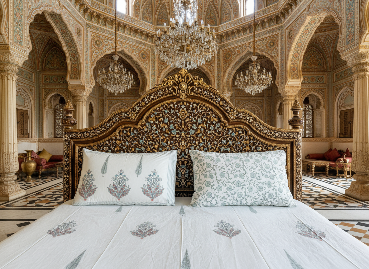 Bring timeless elegance to your bedroom with this handcrafted heritage block print bedsheet set, inspired by the grandeur of Indian palaces. Made from premium-quality cotton, the set includes one generously sized bedsheet and two matching pillowcases.