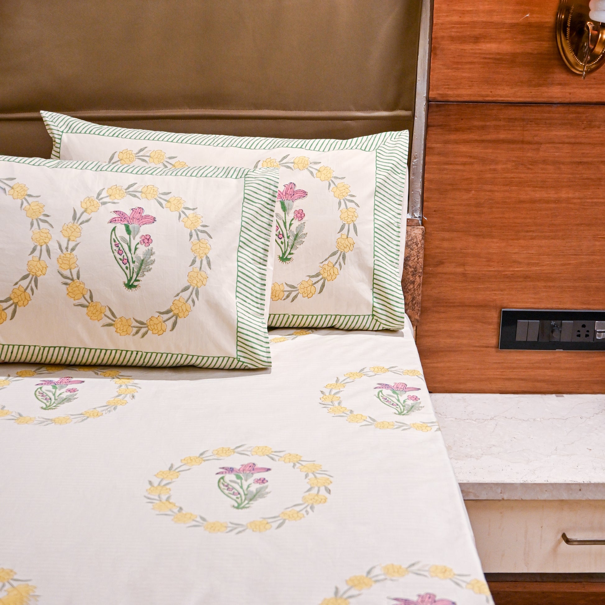 The intricate floral motifs, delicately hand-printed in soft green tones, create a refined and calming aesthetic, while the smooth cotton fabric ensures both comfort and durability. Perfect for those who appreciate artisanal craftsmanship and regal décor, this set adds a touch of ethnic-inspired sophistication to any space.