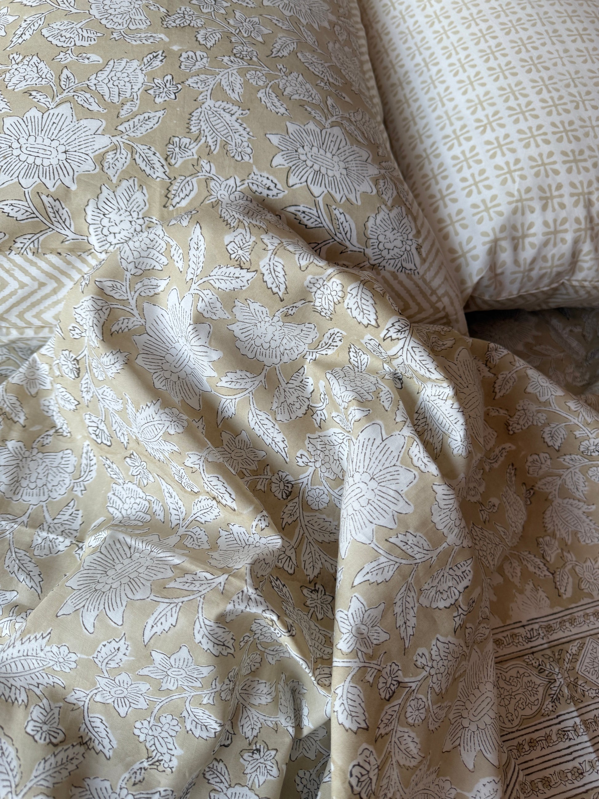 The intricate floral motifs, delicately hand-printed in soft green tones, create a refined and calming aesthetic, while the smooth cotton fabric ensures both comfort and durability. Perfect for those who appreciate artisanal craftsmanship and regal décor, this set adds a touch of ethnic-inspired sophistication to any space.