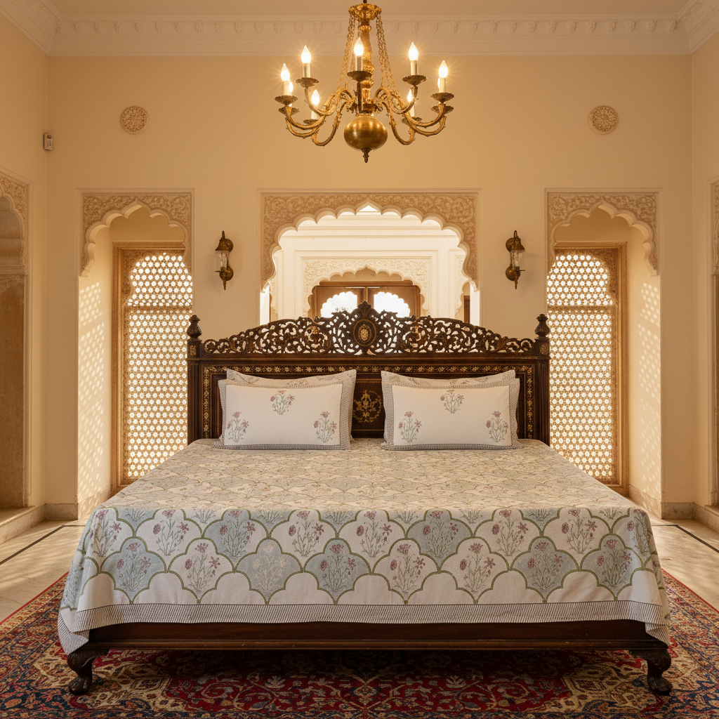 Bring timeless elegance to your bedroom with this handcrafted heritage block print bedsheet set, inspired by the grandeur of Indian palaces. Made from premium-quality cotton, the set includes one generously sized bedsheet and two matching pillowcases.