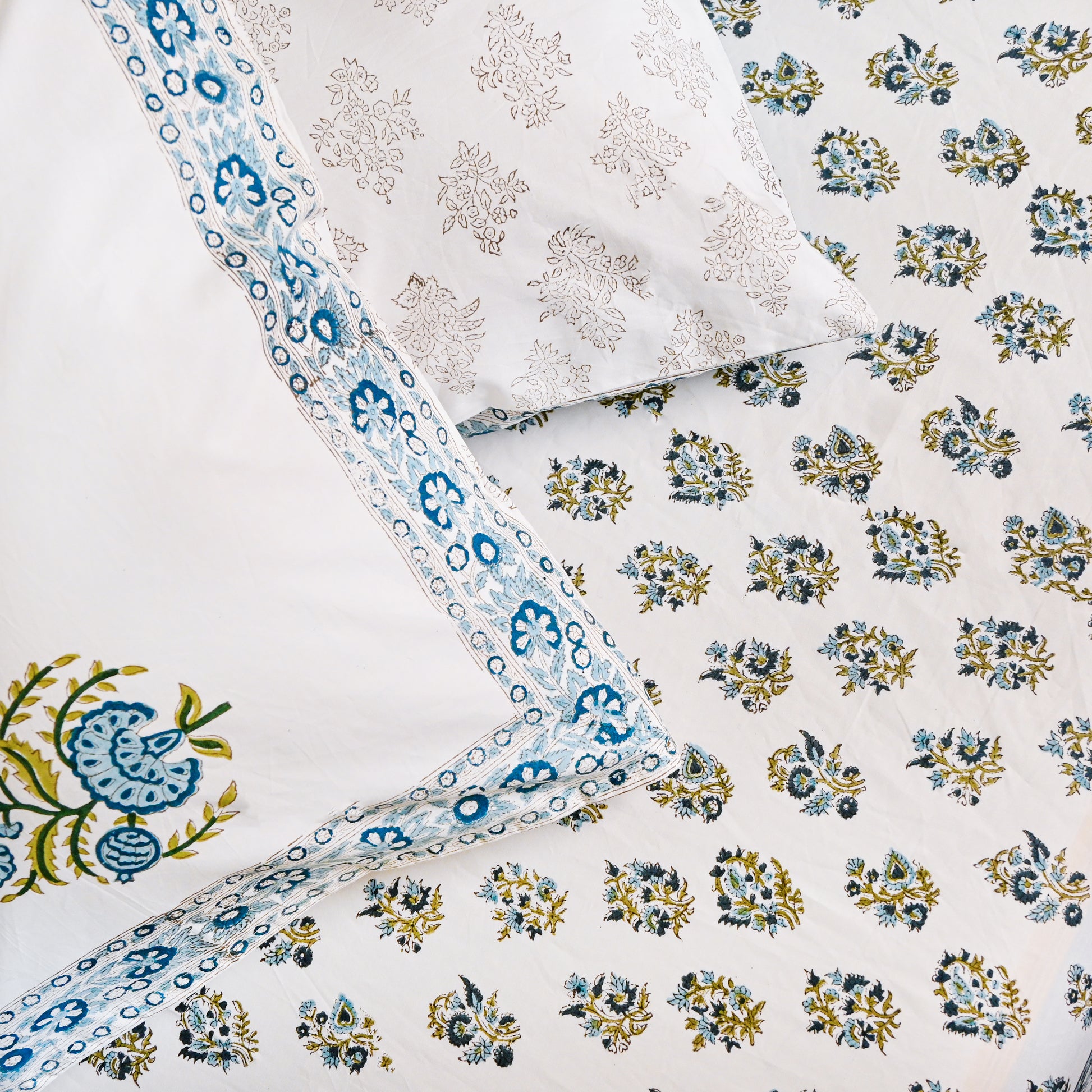 The intricate floral motifs, delicately hand-printed in soft green tones, create a refined and calming aesthetic, while the smooth cotton fabric ensures both comfort and durability. Perfect for those who appreciate artisanal craftsmanship and regal décor, this set adds a touch of ethnic-inspired sophistication to any space.
