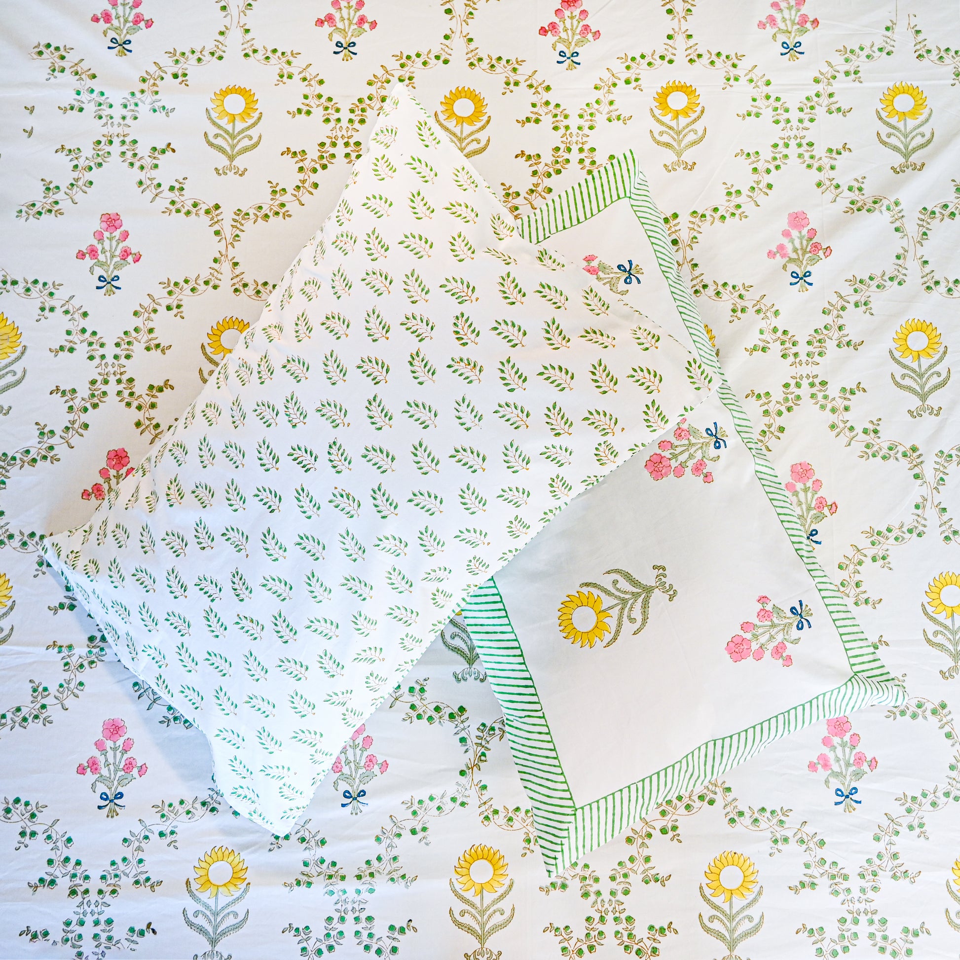 The intricate floral motifs, delicately hand-printed in soft green tones, create a refined and calming aesthetic, while the smooth cotton fabric ensures both comfort and durability. Perfect for those who appreciate artisanal craftsmanship and regal décor, this set adds a touch of ethnic-inspired sophistication to any space.