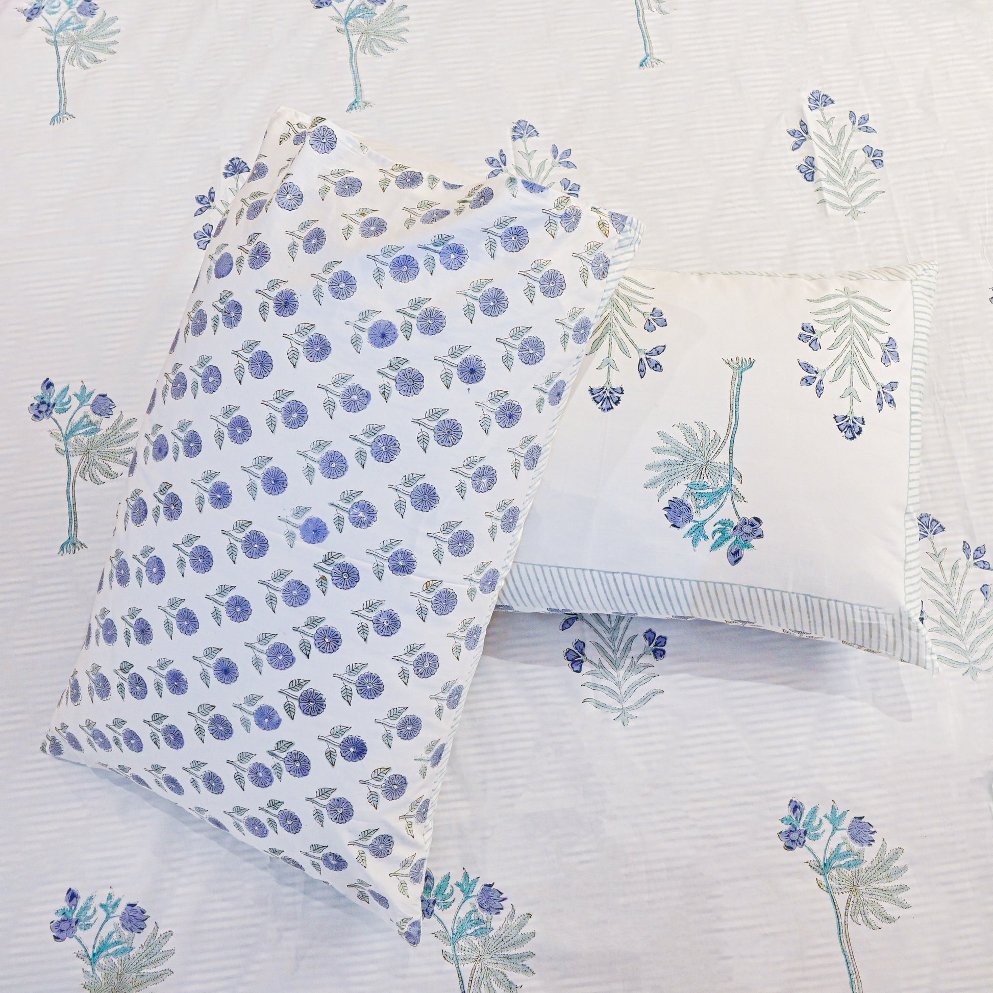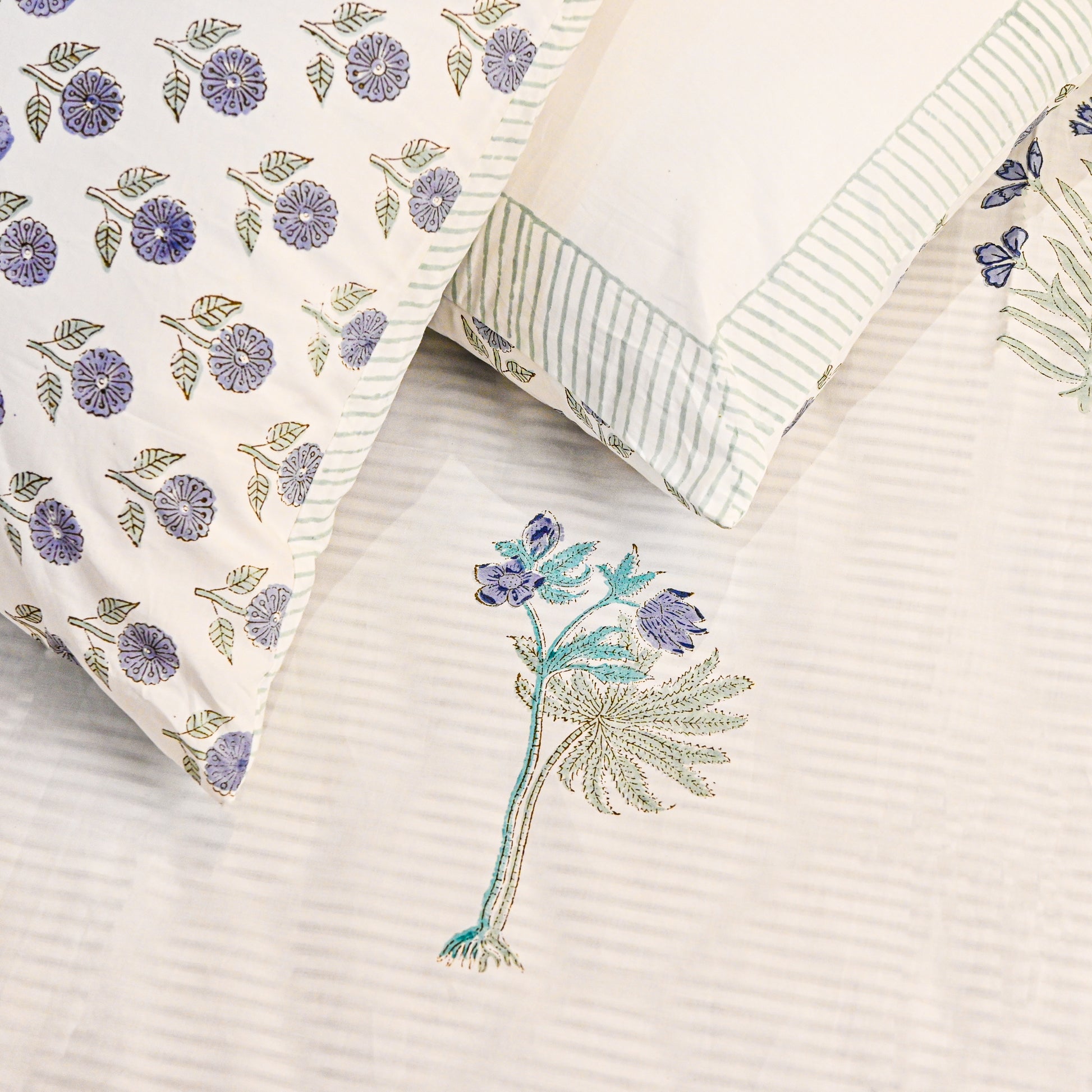 The intricate floral motifs, delicately hand-printed in soft green tones, create a refined and calming aesthetic, while the smooth cotton fabric ensures both comfort and durability. Perfect for those who appreciate artisanal craftsmanship and regal décor, this set adds a touch of ethnic-inspired sophistication to any space.