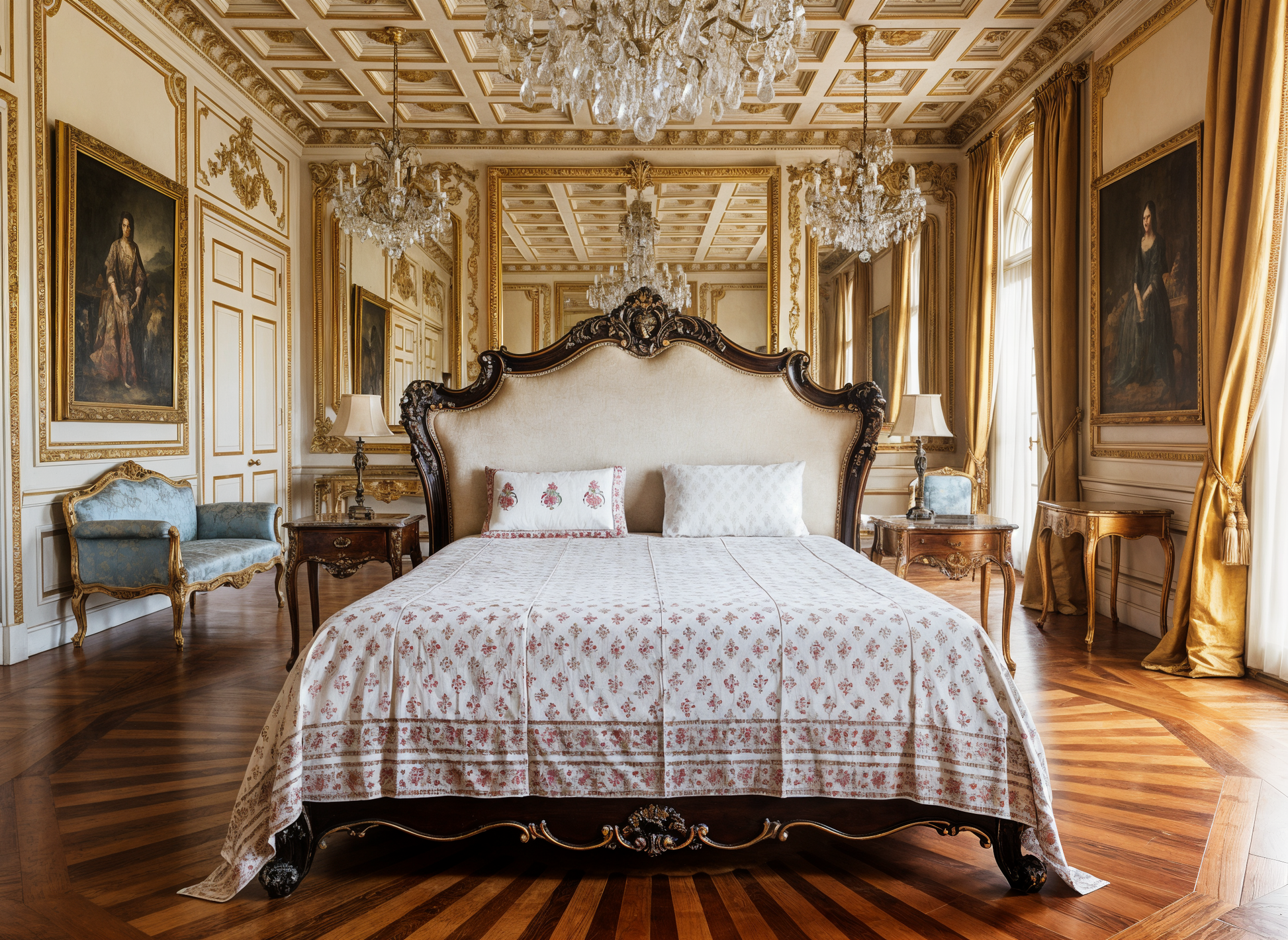 Bring timeless elegance to your bedroom with this handcrafted heritage block print bedsheet set, inspired by the grandeur of Indian palaces. Made from premium-quality cotton, the set includes one generously sized bedsheet and two matching pillowcases.