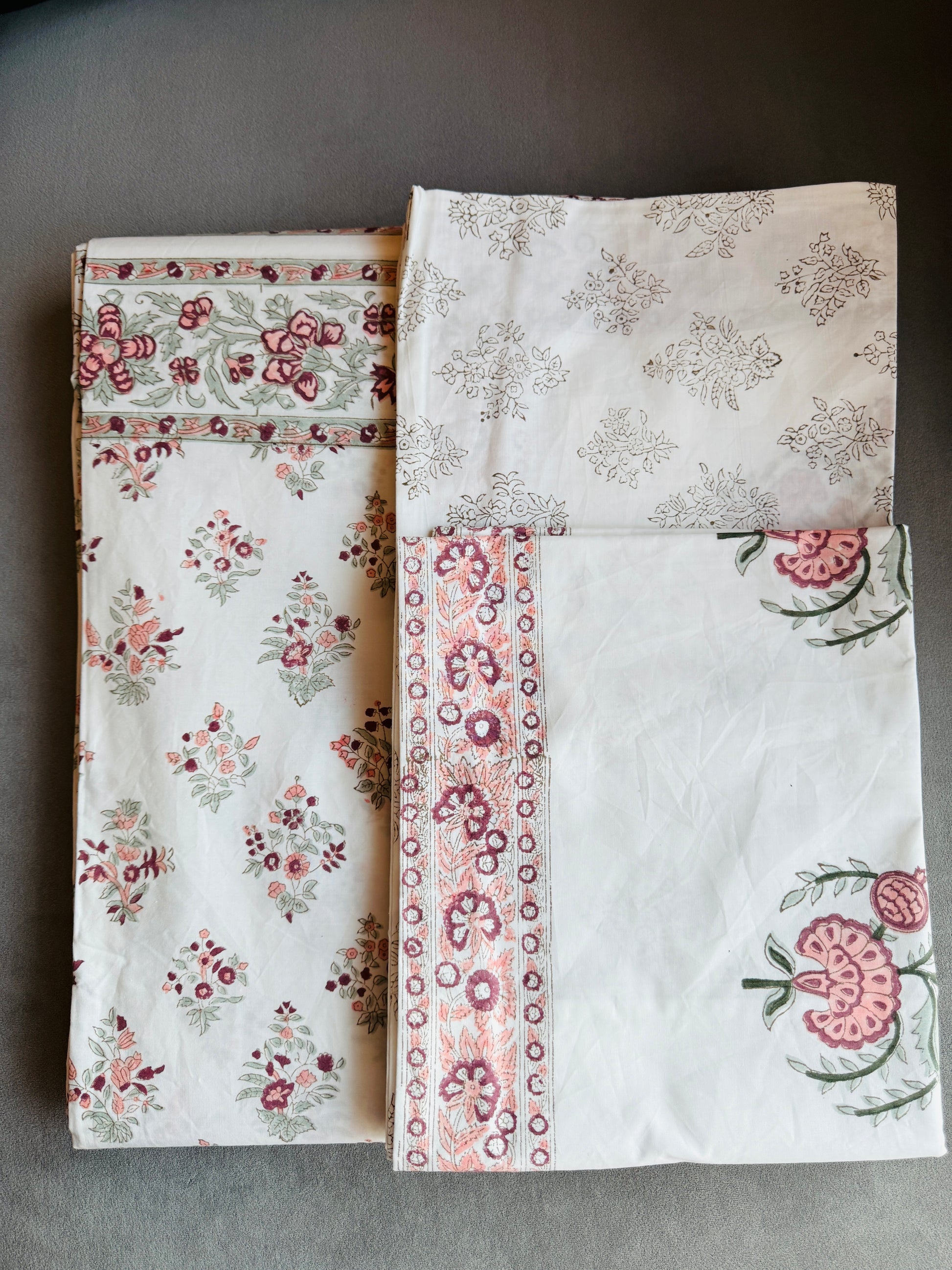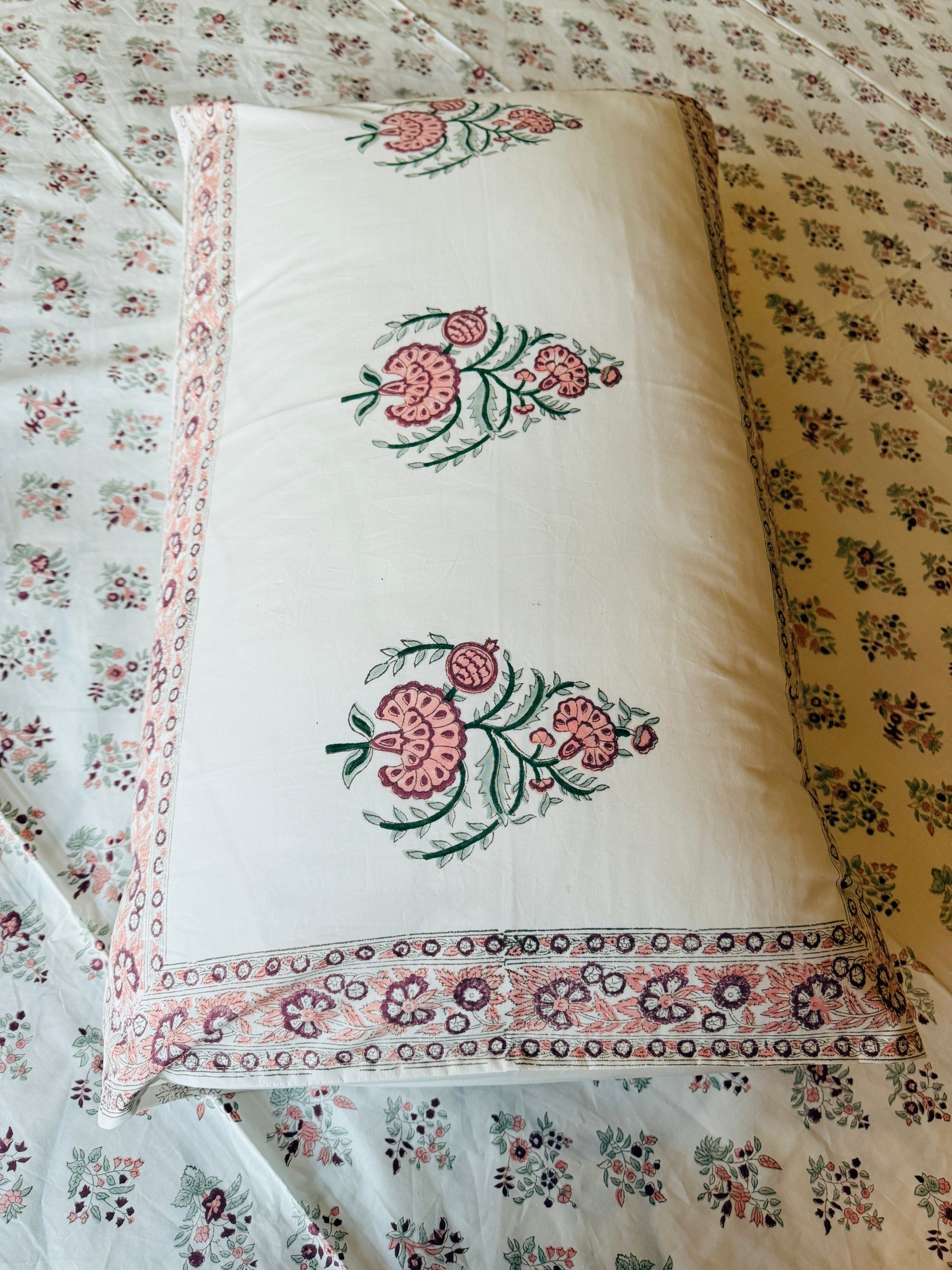 The intricate floral motifs, delicately hand-printed in soft green tones, create a refined and calming aesthetic, while the smooth cotton fabric ensures both comfort and durability. Perfect for those who appreciate artisanal craftsmanship and regal décor, this set adds a touch of ethnic-inspired sophistication to any space.